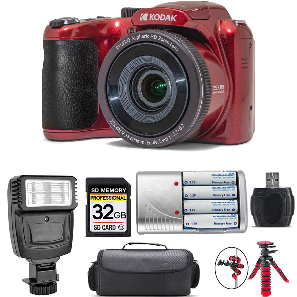 Kodak PIXPRO AZ255 Digital Camera (Red) + Extra Battery + Flash - 32GB Kit