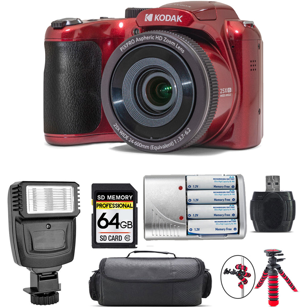 Kodak PIXPRO AZ255 Digital Camera (Red) + Extra Battery + Flash - 64GB Kit