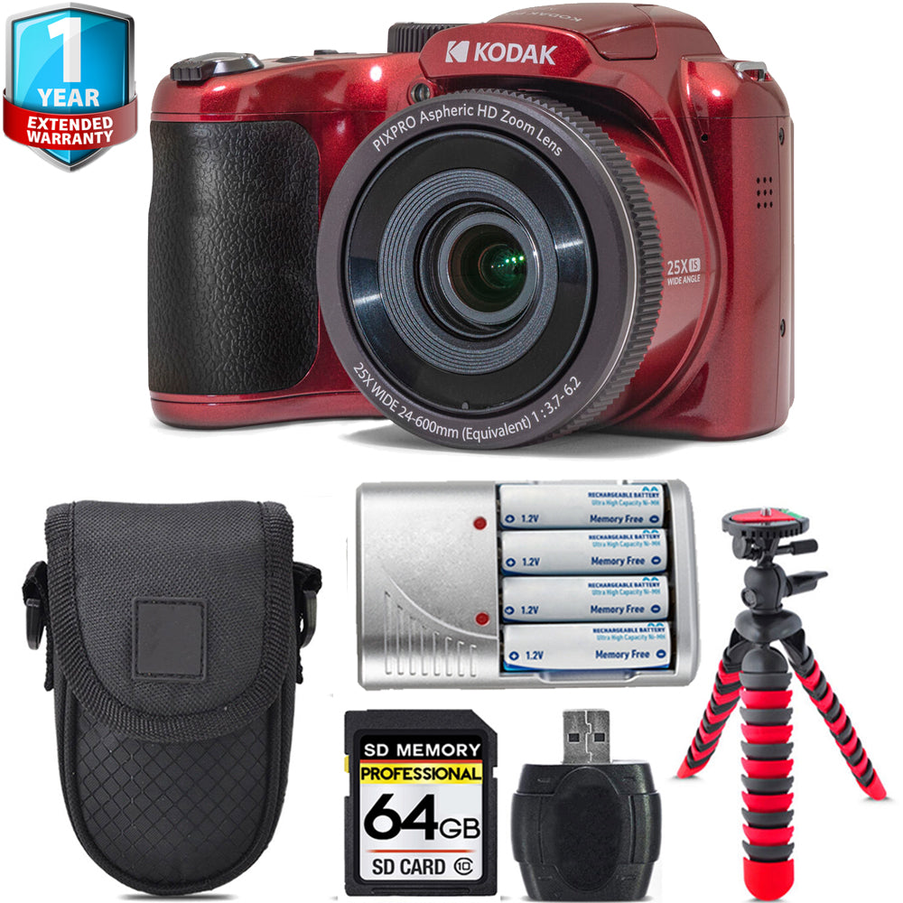 Kodak PIXPRO AZ255 Digital Camera (Red) + Extra Battery +Tripod + 1 Yr Warranty -64GB Kit