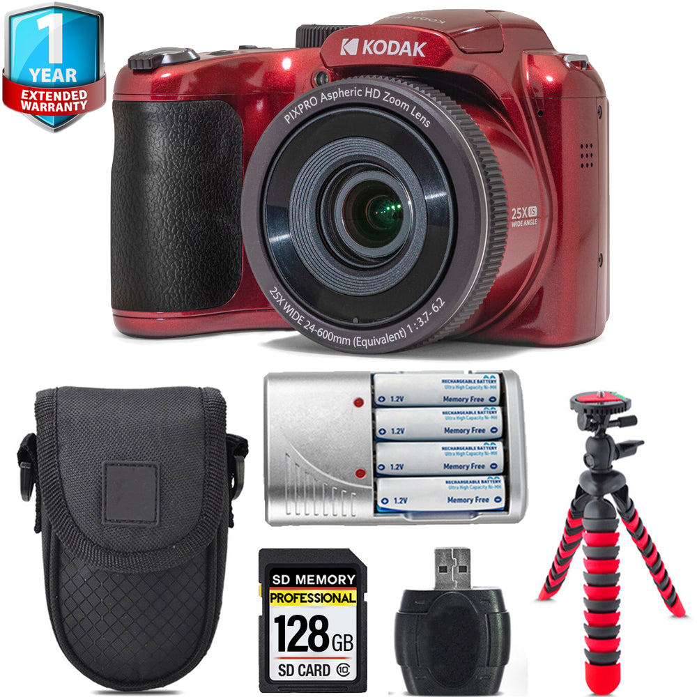 Kodak PIXPRO AZ255 Digital Camera (Red) + Extra Battery +1 Yr Warranty + Case -128GB