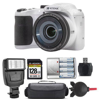 Kodak PIXPRO AZ255 Digital Camera (White) + Extra Battery + Flash - 128GB Kit