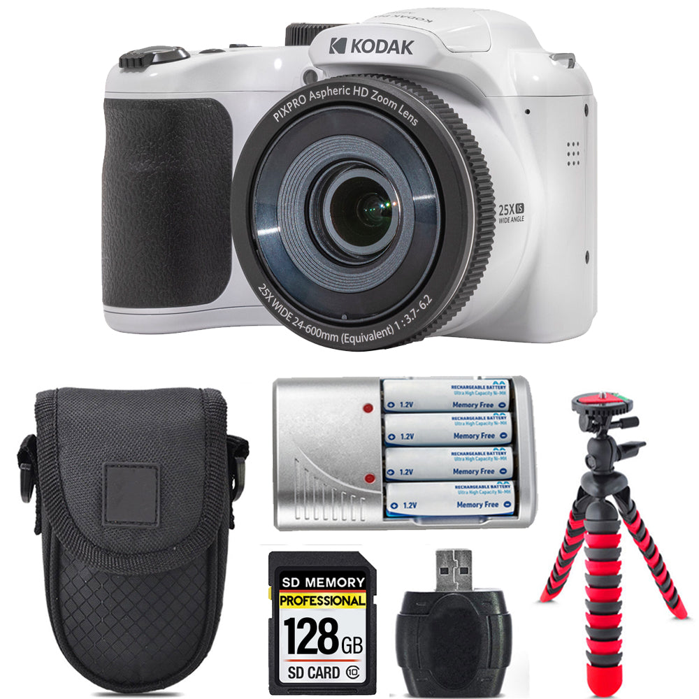 Kodak PIXPRO AZ255 Digital Camera (White) + Extra Battery +Tripod + Case -128GB Kit