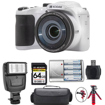 Kodak PIXPRO AZ255 Digital Camera (White) + Extra Battery + Flash - 64GB Kit