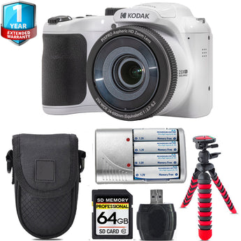 Kodak PIXPRO AZ255 Digital Camera (White) + Extra Battery +Tripod + 1 Yr Warranty -64GB Kit