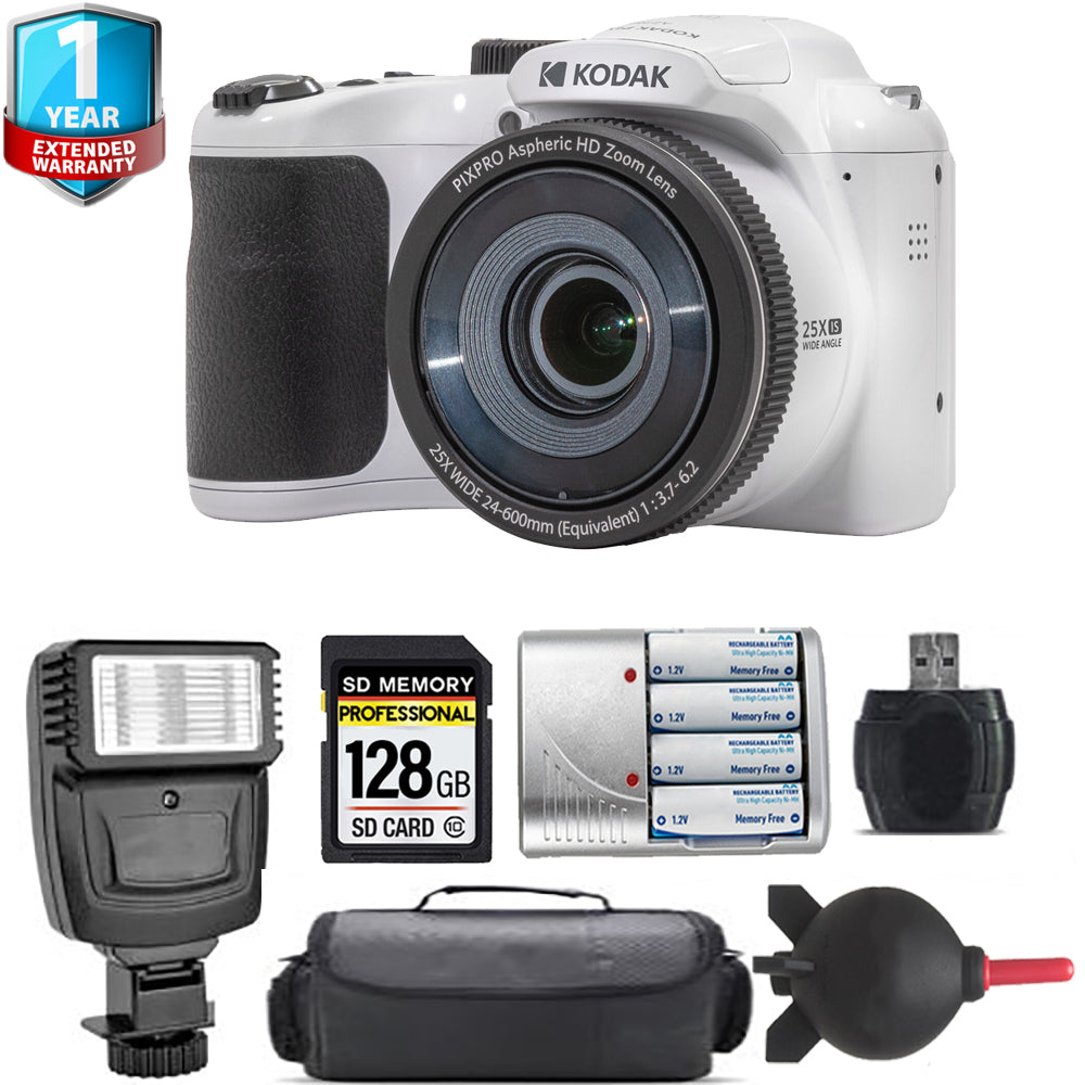 Kodak PIXPRO AZ255 Digital Camera (White) + Extra Battery + Flash+ 1 Yr Warranty