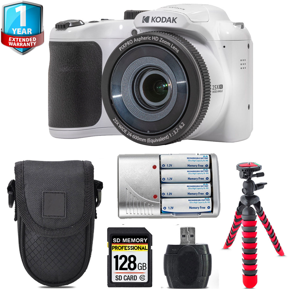 Kodak PIXPRO AZ255 Digital Camera (White) + Extra Battery +1 Yr Warranty + Case -128GB