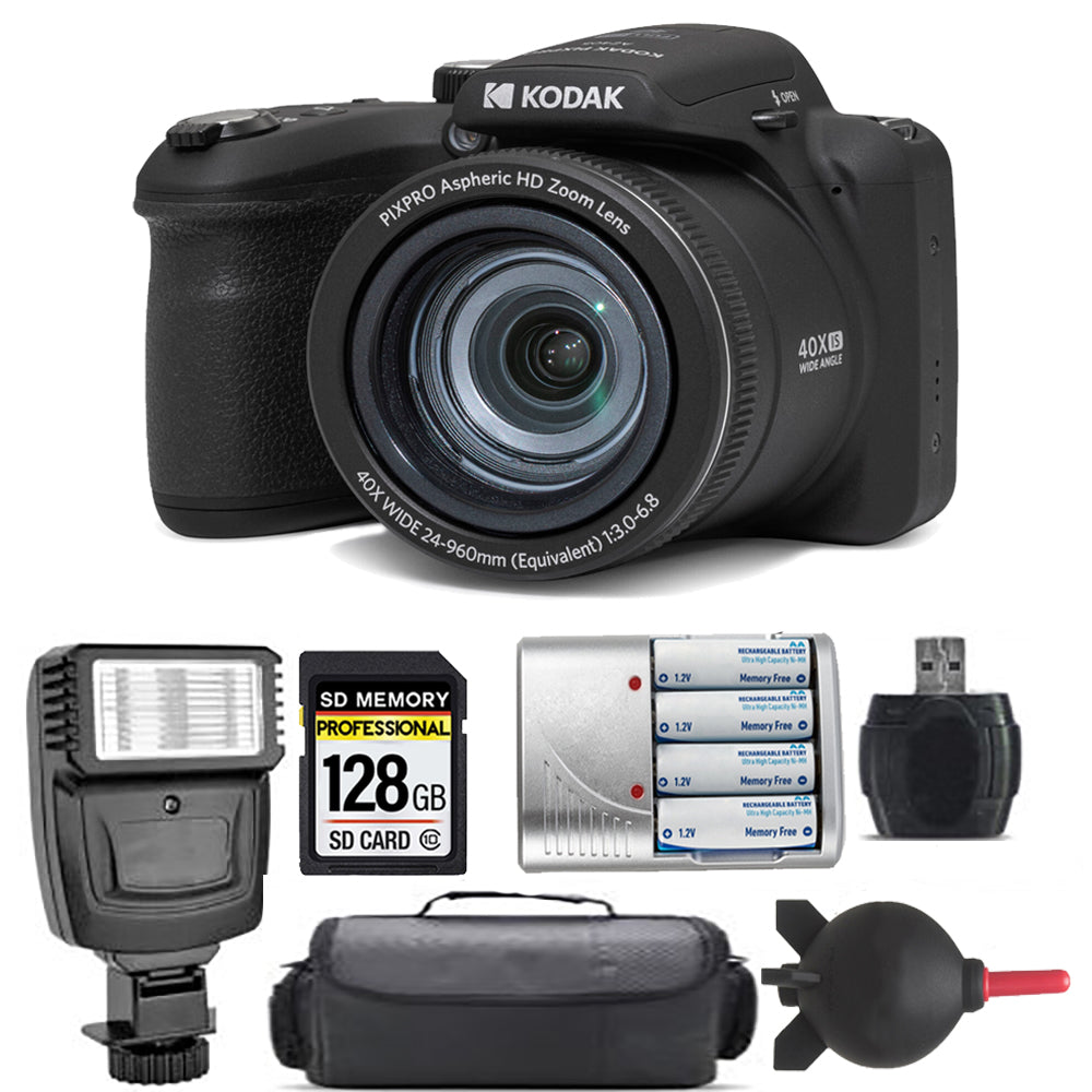 Kodak PIXPRO AZ405 Digital Camera (Black) + Extra Battery + Flash - 128GB Kit