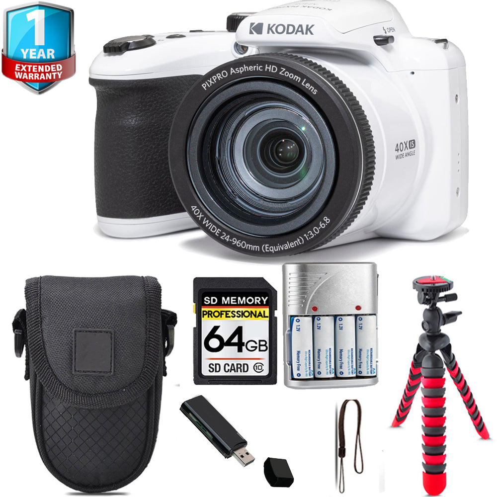 Kodak PIXPRO AZ405 Digital Camera (White) + Tripod + 1 Yr Warranty - 64GB Kit