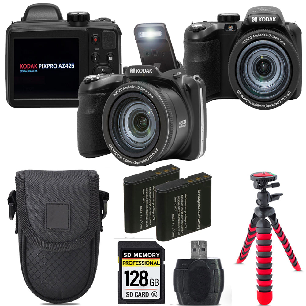 Kodak PIXPRO AZ425 Digital Camera (Black) + Extra Battery +Tripod + Case -128GB Kit