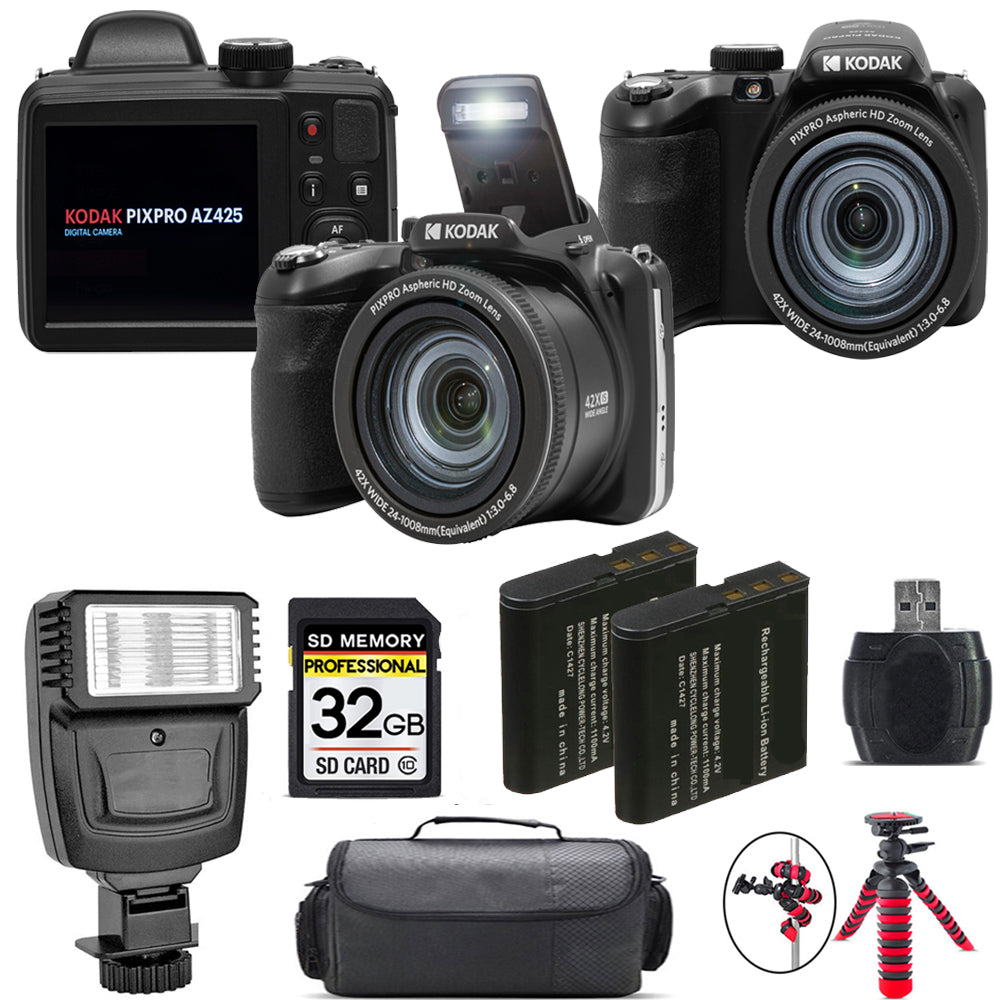 Kodak PIXPRO AZ425 Digital Camera (Black) + Extra Battery + Flash - 32GB Kit