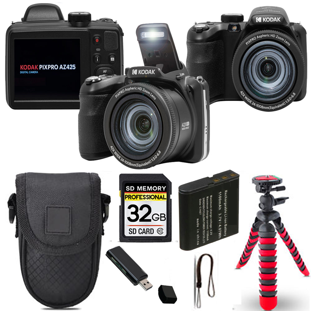 Kodak PIXPRO AZ425 Digital Camera (Black) + Spider Tripod + Case - 32GB Kit