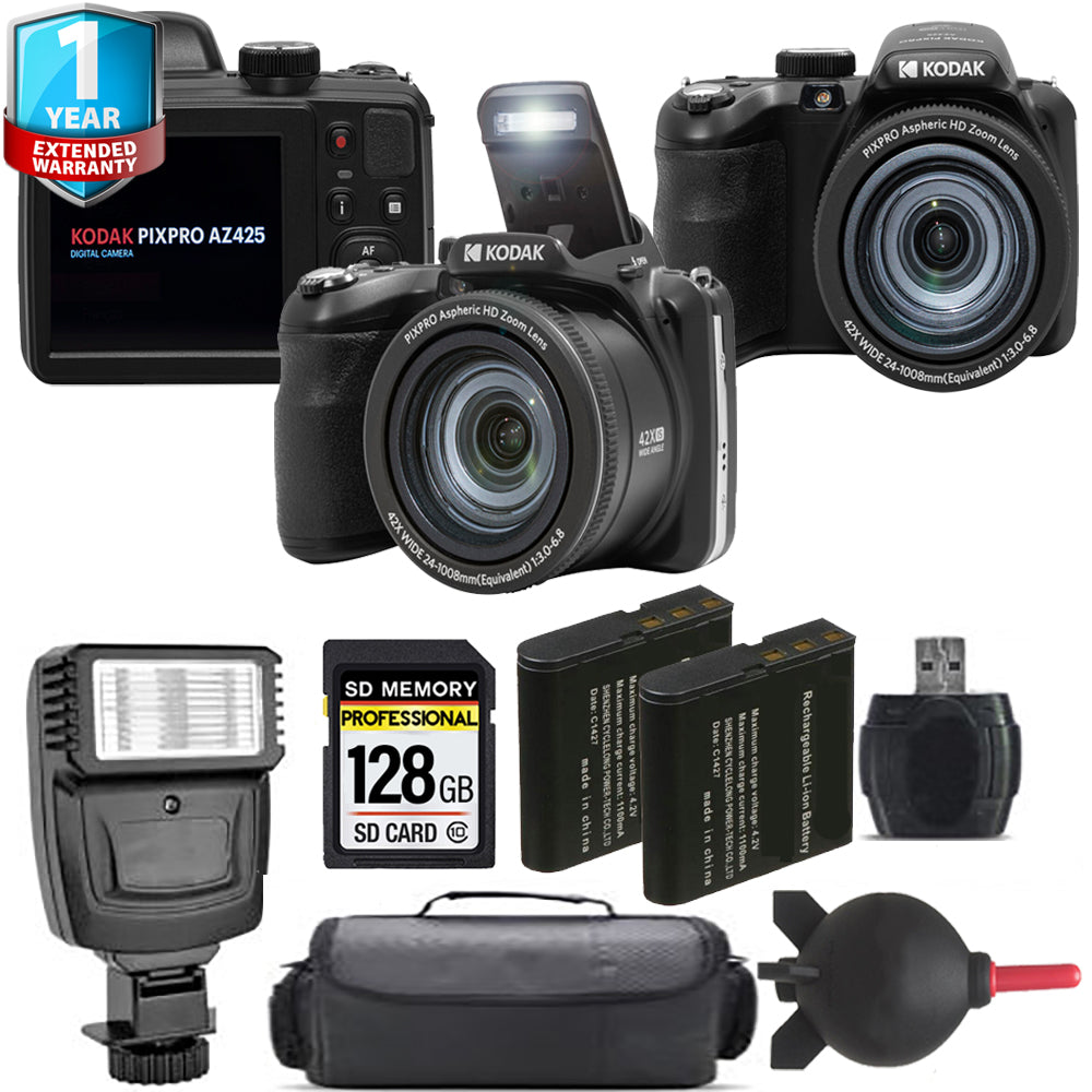 Kodak PIXPRO AZ425 Digital Camera (Black) + Extra Battery + Flash+ 1 Yr Warranty