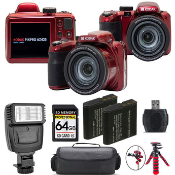Kodak PIXPRO AZ425 Digital Camera (Red) + Extra Battery + Flash - 64GB Kit