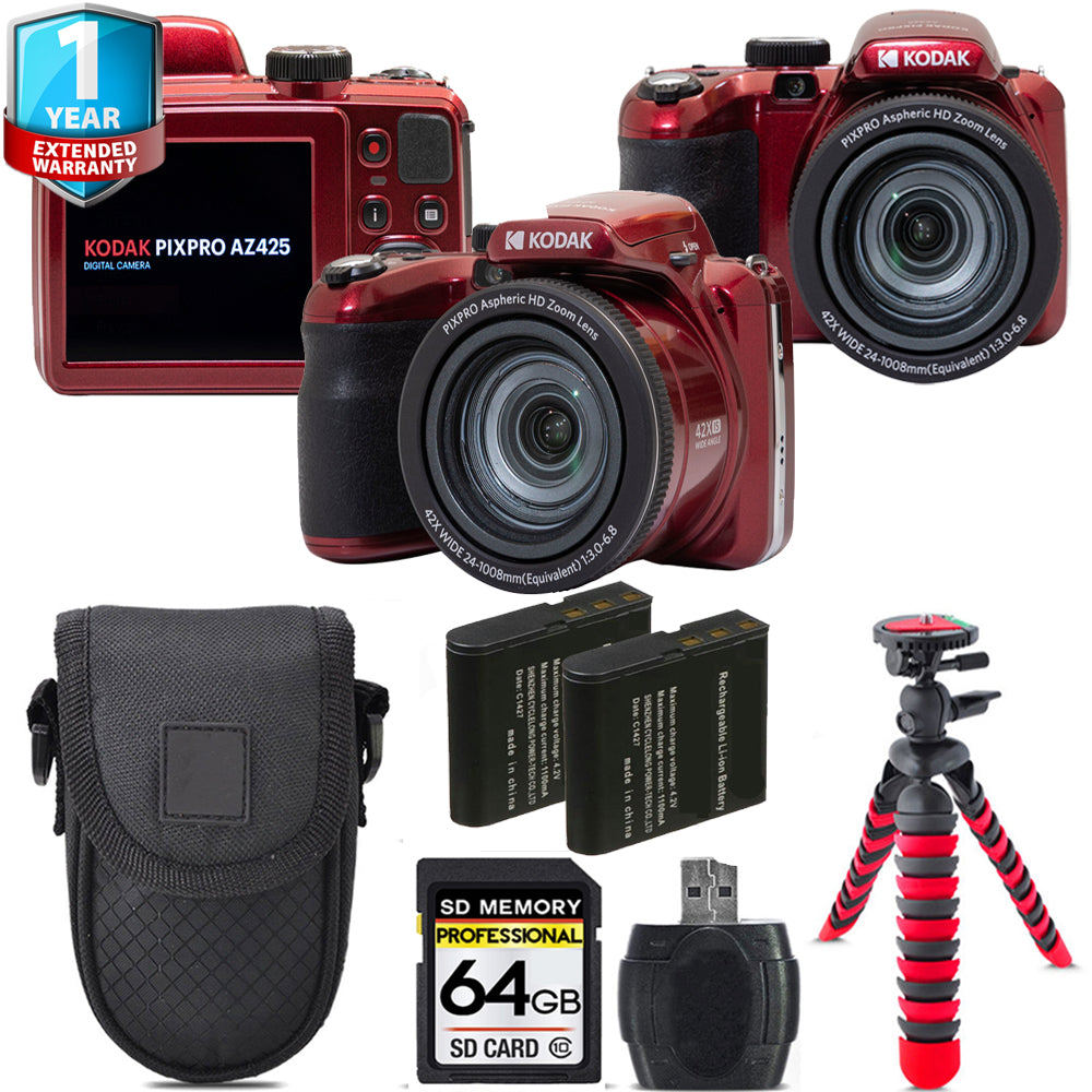 Kodak PIXPRO AZ425 Digital Camera (Red) + Extra Battery +Tripod + 1 Yr Warranty -64GB Kit