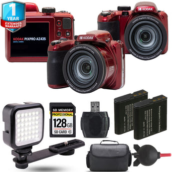 Kodak PIXPRO AZ425 Digital Camera (Red) + Extra Battery + 1 Yr Warranty - 128GB Kit
