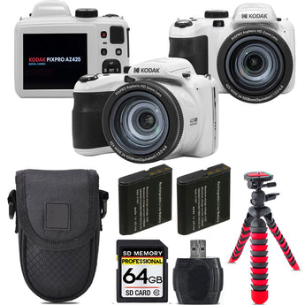 Kodak PIXPRO AZ425 Digital Camera (White) + Extra Battery +Tripod + Case -64GB Kit