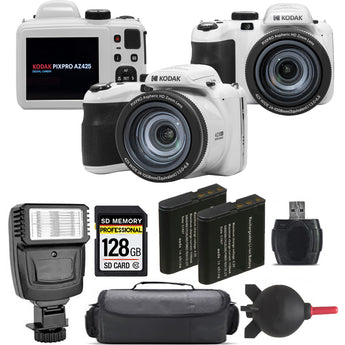 Kodak PIXPRO AZ425 Digital Camera (White) + Extra Battery + Flash - 128GB Kit