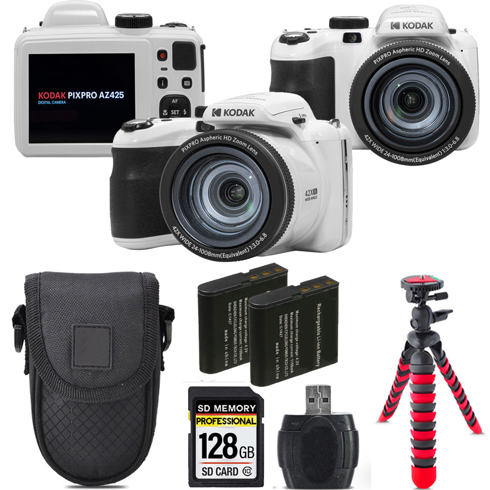 Kodak PIXPRO AZ425 Digital Camera (White) + Extra Battery +Tripod + Case -128GB Kit