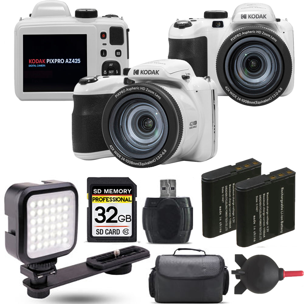 Kodak PIXPRO AZ425 Digital Camera (White)+ Extra Battery + LED - 32GB Kit