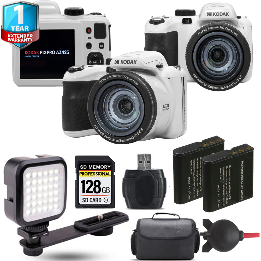 Kodak PIXPRO AZ425 Digital Camera (White) + Extra Battery + 1 Yr Warranty - 128GB Kit