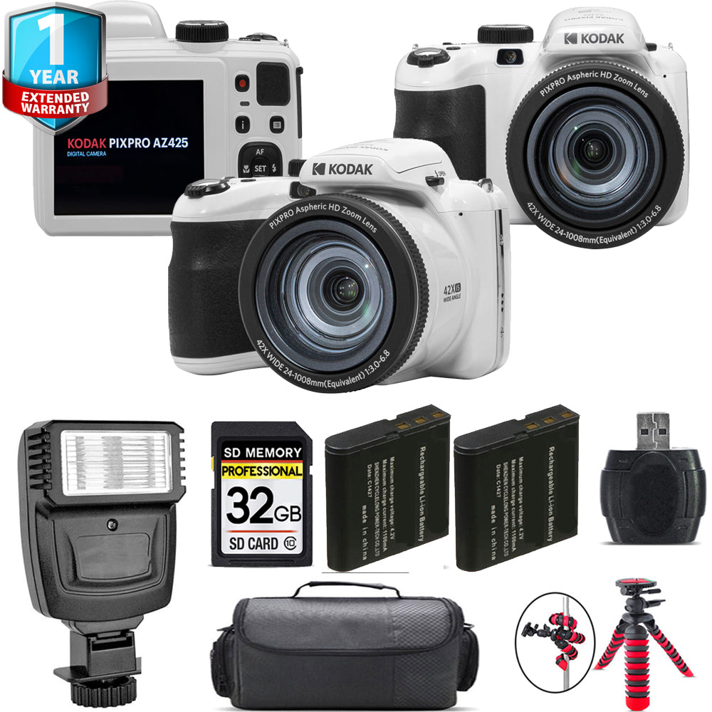 Kodak PIXPRO AZ425 Digital Camera (White) + Extra Battery + 1 Yr Warranty + 32GB
