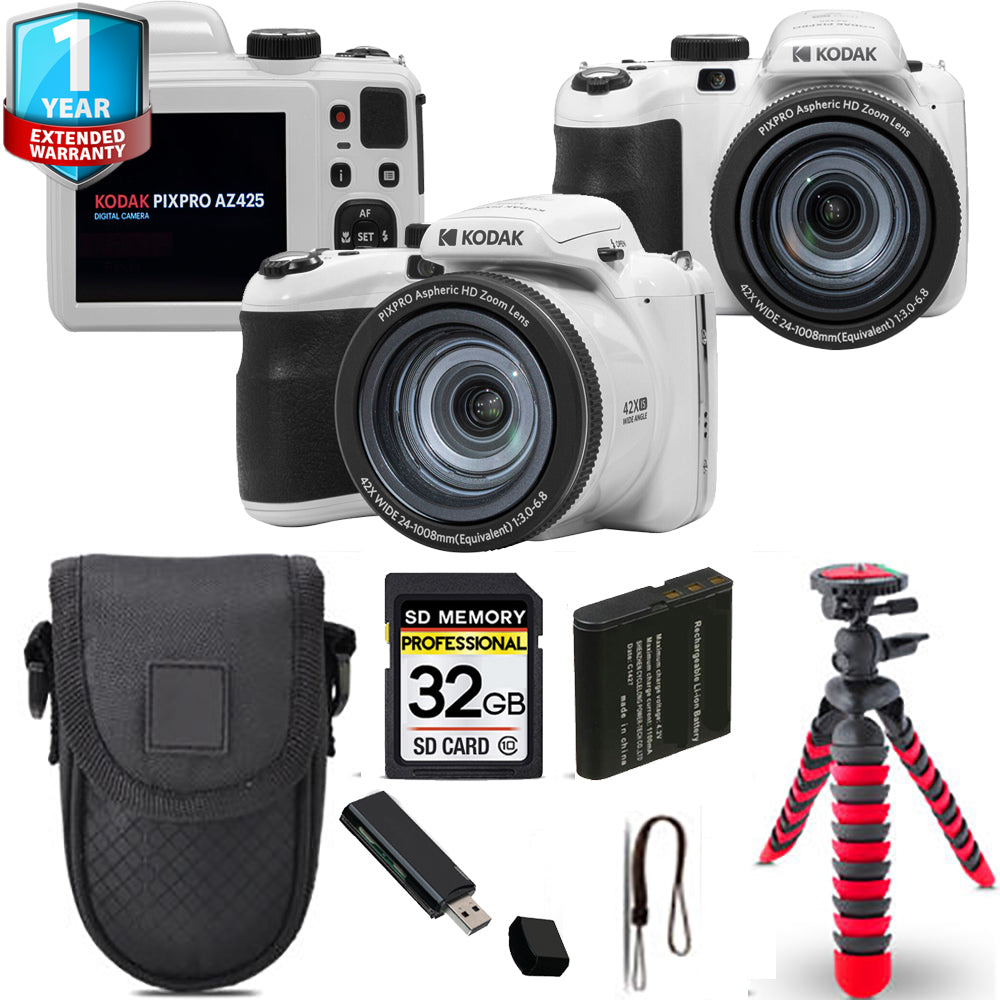 Kodak PIXPRO AZ425 Digital Camera (White) + Spider Tripod + Case+ 1 Yr Warranty
