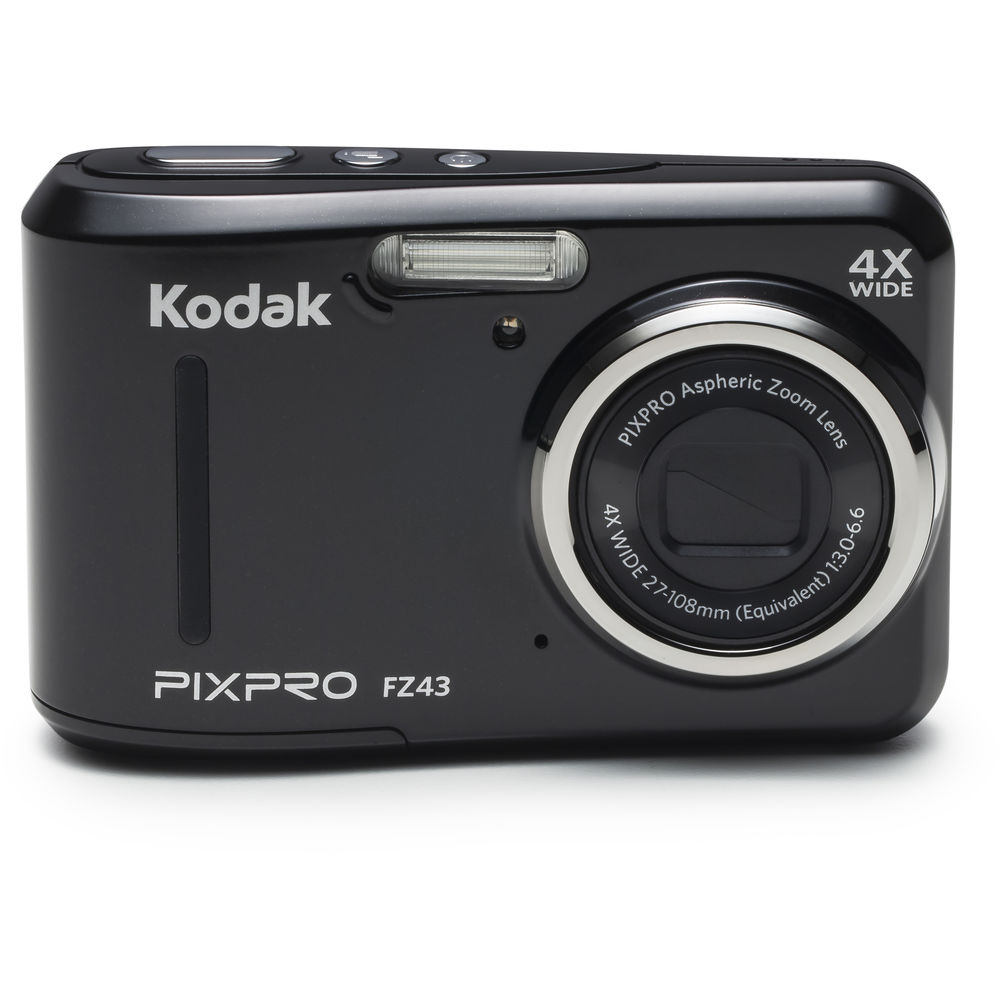 The Pixpro FZ45 Digital Camera from Kodak is a small black point and shoot that is one of the friendly zoom models from the Kodak Pixpro digital camera collection. Small and easy to use, this camera is an ideal choice for on-the-go shooting. It is conveniently powered by two AA batteries and features a 2.7" LCD screen a 4x optical zoom, one-touch full HD video, red-eye removal, face detection, and more.