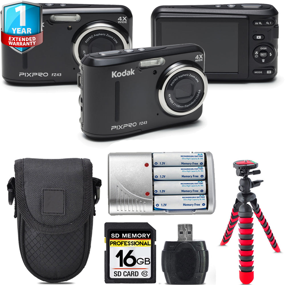 Kodak PIXPRO FZ43 Digital Camera (Black) + Extra Battery +1 Yr Warranty + Case -16GB