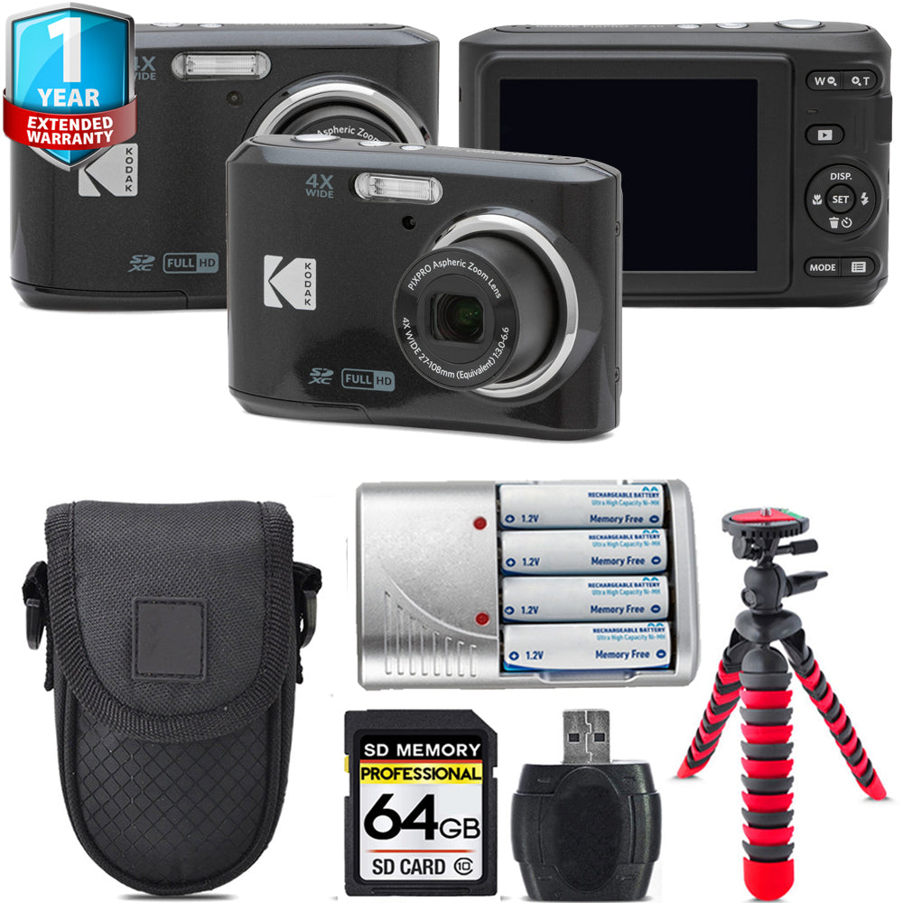 Kodak Pixpro FZ45 Camera (Black) + Extra Battery +Tripod + 1 Yr Warranty -64GB Kit