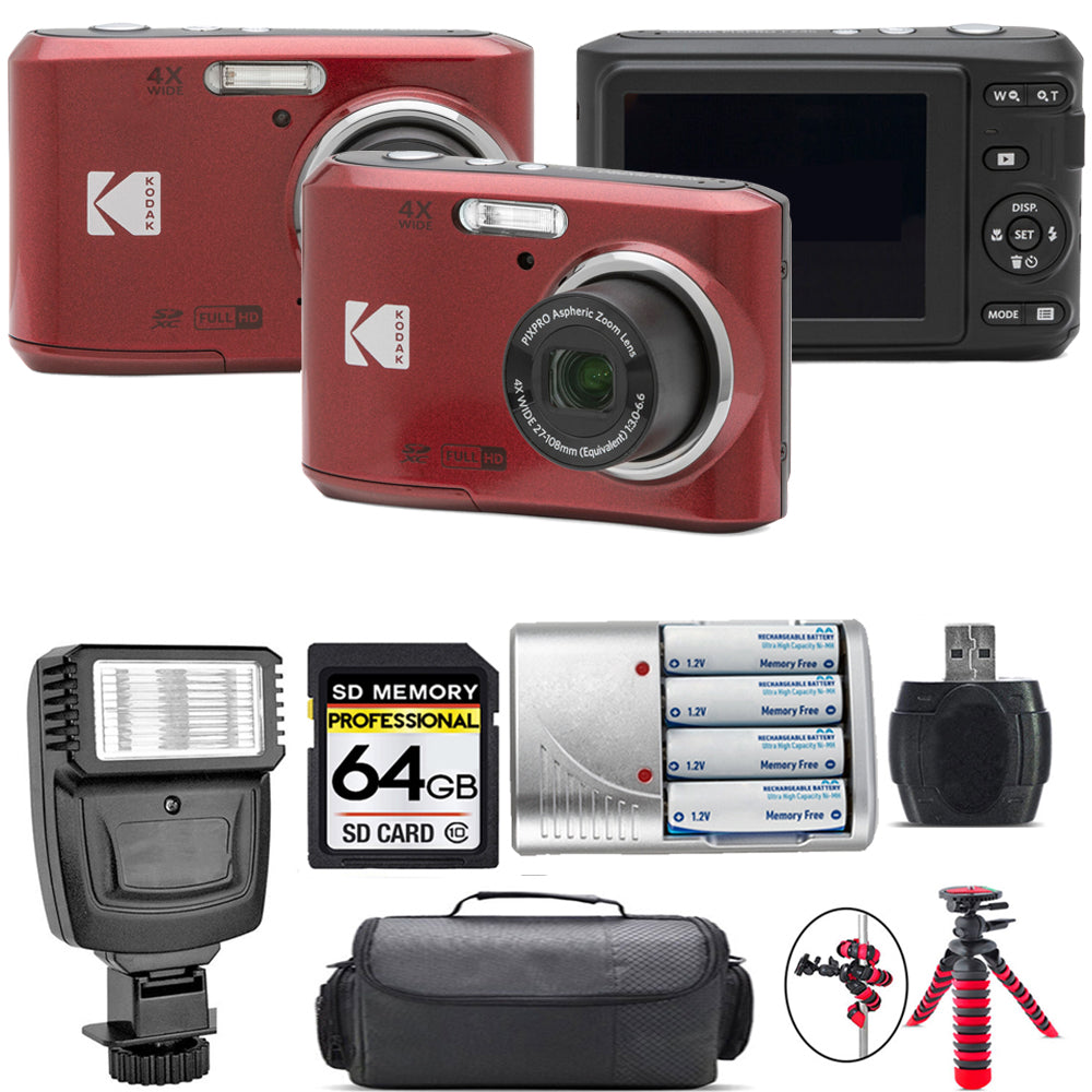 Kodak Pixpro FZ45 Camera (Red) + Extra Battery + Flash - 64GB Kit