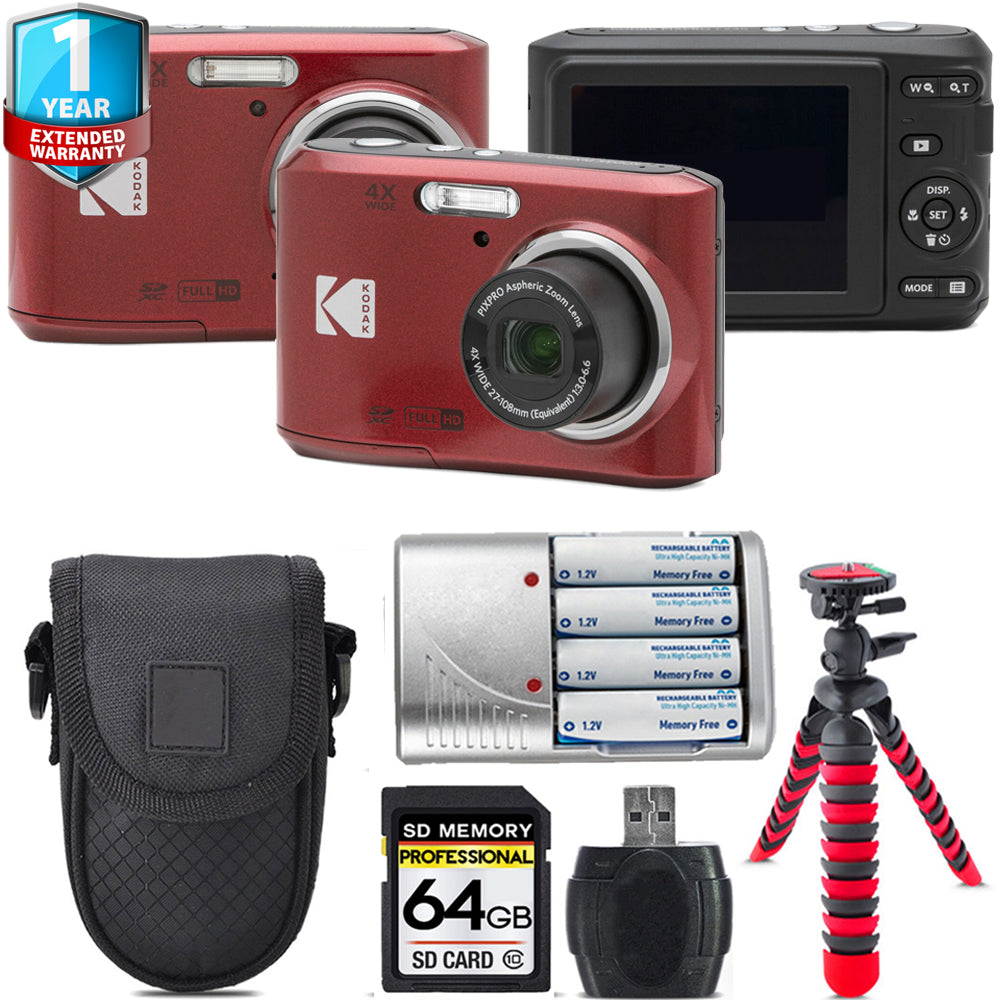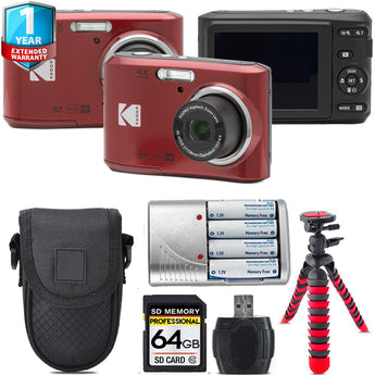 Kodak Pixpro FZ45 Camera (Red) + Extra Battery +Tripod + 1 Yr Warranty -64GB Kit