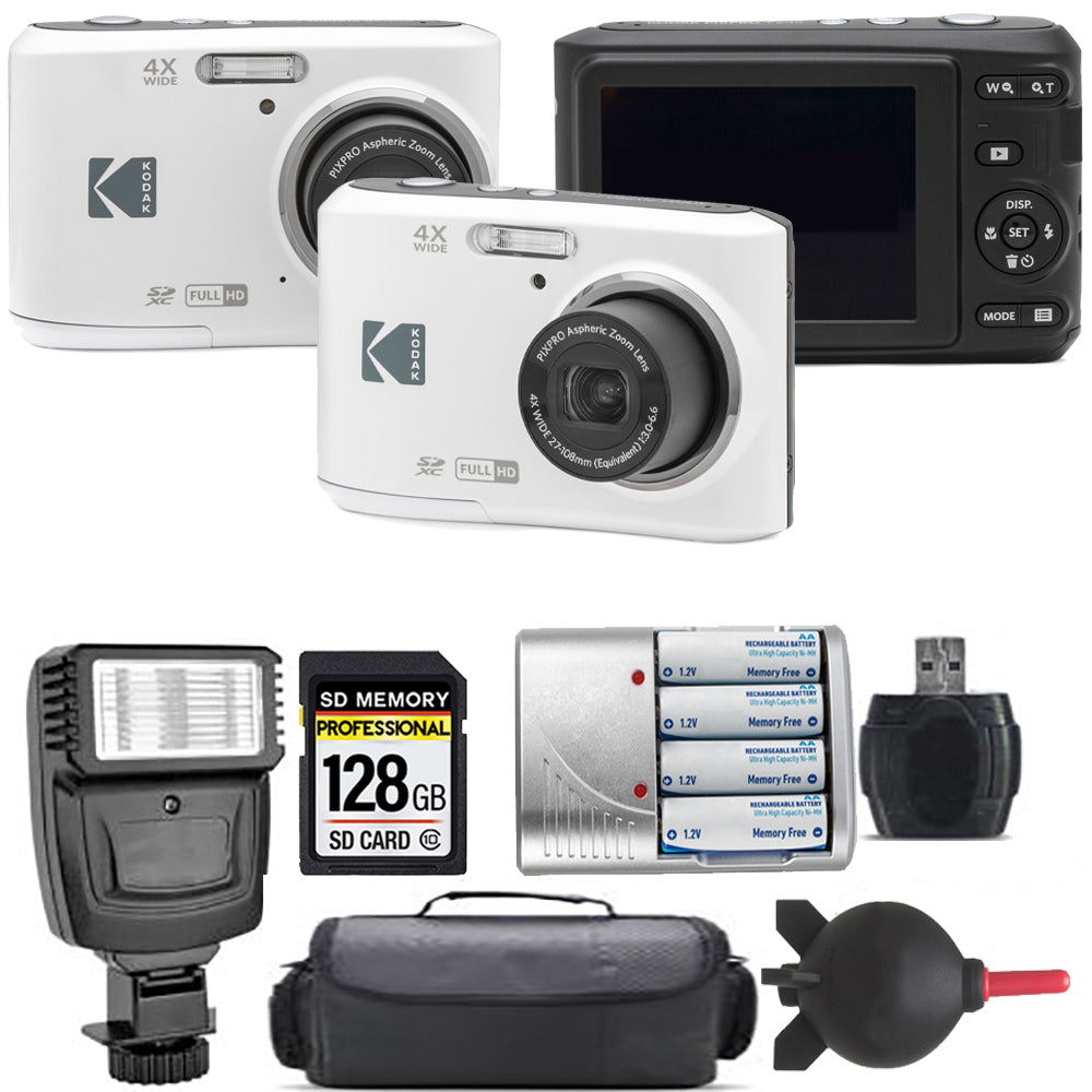 Kodak Pixpro FZ45 Camera (White) + Extra Battery + Flash - 128GB Kit