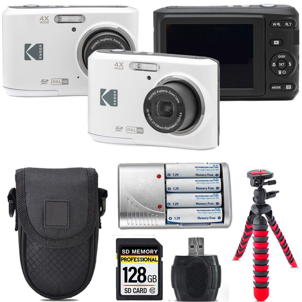 Kodak Pixpro FZ45 Camera (White) + Extra Battery +Tripod + Case -128GB Kit