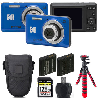 Kodak PIXPRO FZ55 Digital Camera (Blue) + Extra Battery +Tripod + Case -128GB Kit