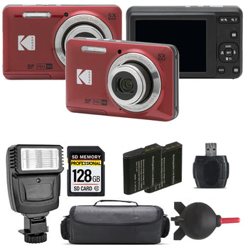 Kodak PIXPRO FZ55 Digital Camera (Red) + Extra Battery + Flash - 128GB Kit