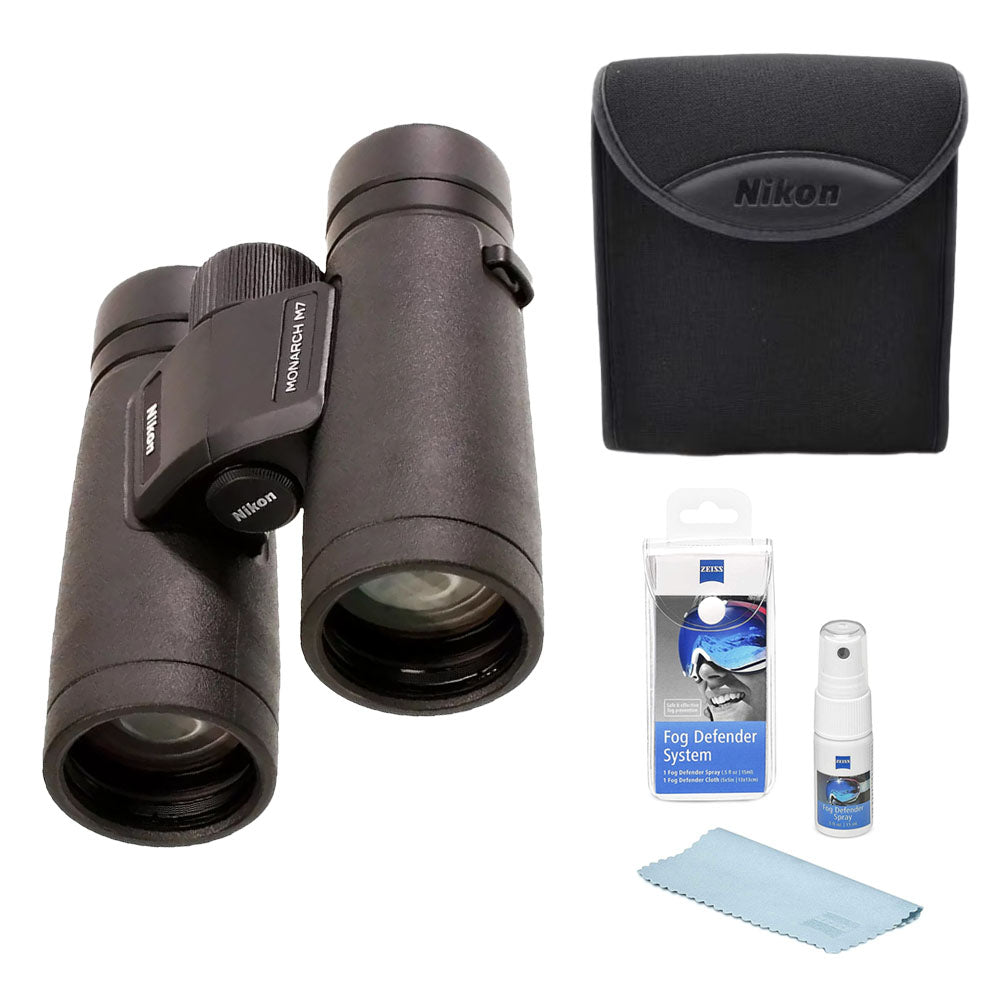Kit Main Item Description: Boasting a wide viewing angle that presents an immersive viewing experience, Nikon's black 8x42 Monarch M7 Binoculars have improved design features compared to previous iterations, with the same focus on comfort and performance the line is known for. Featuring extra-low dispersion glass elements with anti-reflection fully multicoated optics and highly reflective dielectric-coated, phase-corrected roof prisms, complemented by exterior lens coatings that repel water and oil, the Monarch M7 produces bright and clear high-contrast images with true-to-life color and minimal color fringing.