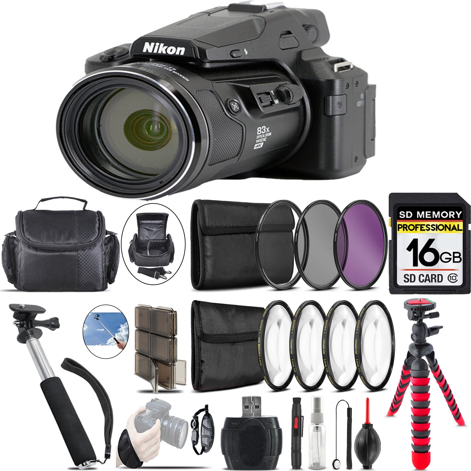 About Nikon COOLPIX P950 Digital Camera + Spider Tripod + Case - 16GB Bundle