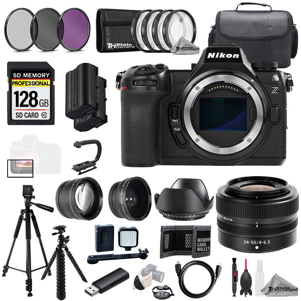 About Nikon Z6 III + Z 24-50mm f/4-6.3 Lens+128GB+Ext Bat+9 PC Filtr MEGA Kit