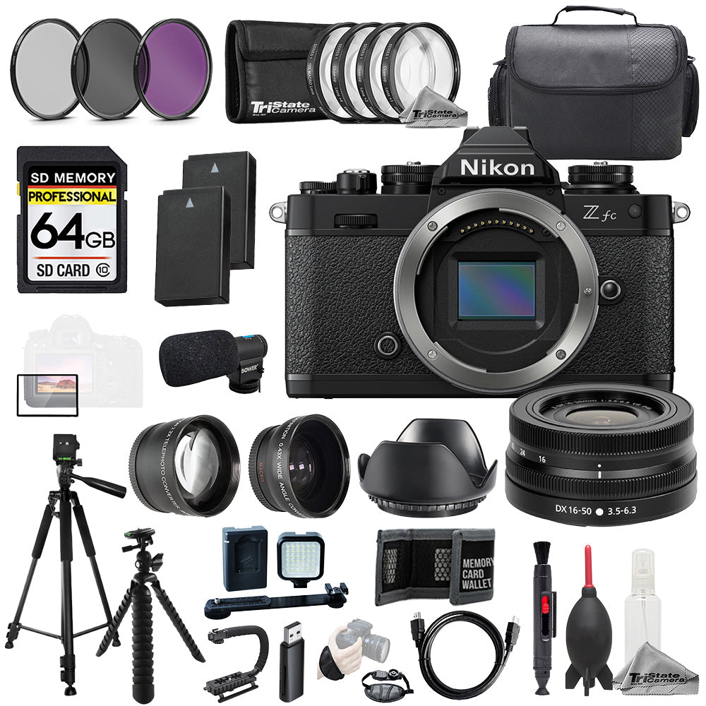 About Nikon Zfc + Z DX 16-50mm f/3.5-6.3 VR Lens (Black) + Mic +64GB+ 9 PC Filter-MEGA Kit