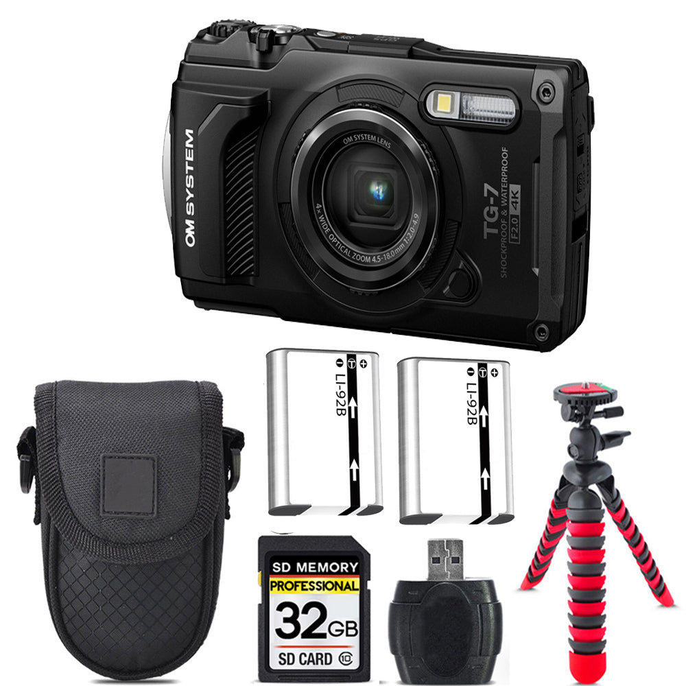 Olympus OM SYSTEM Tough TG-7 Digital Camera (Black) + Extra Battery +Tripod + Case -32GB Kit