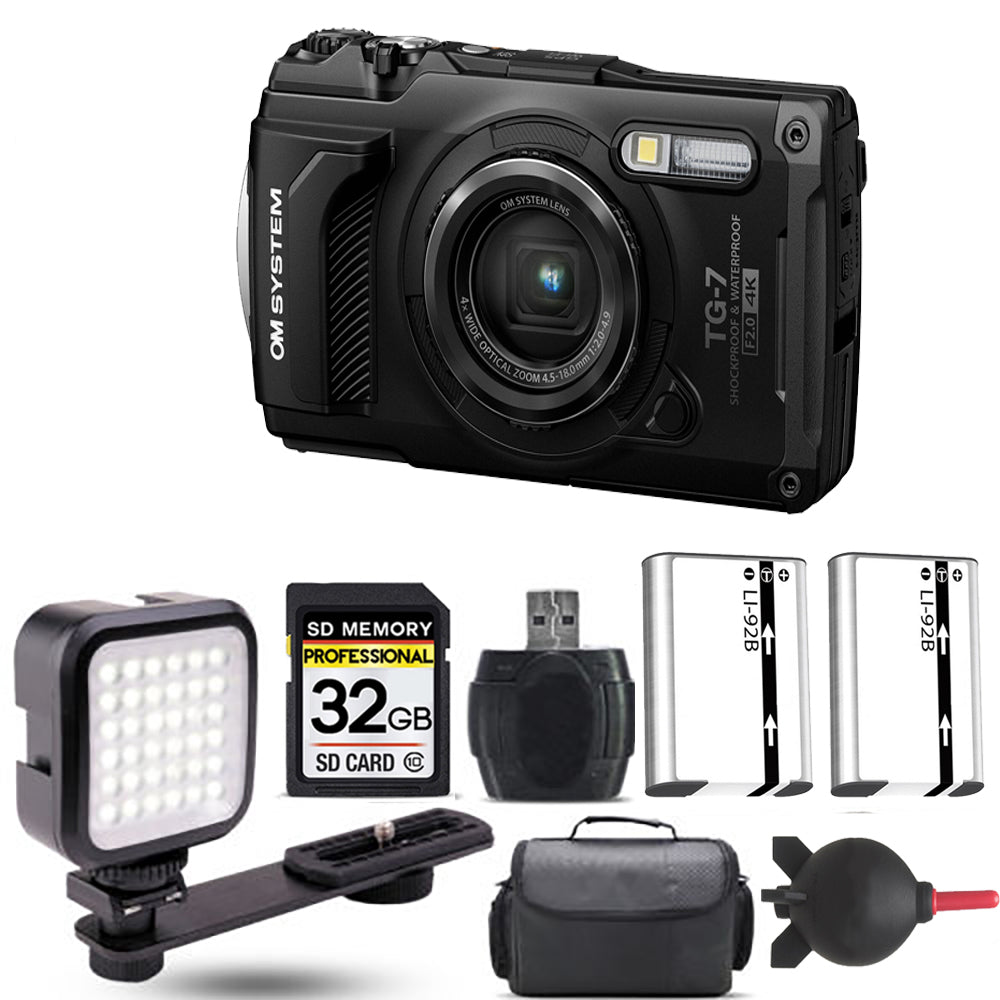 Olympus OM SYSTEM Tough TG-7 Digital Camera (Black)+ Extra Battery + LED - 32GB Kit