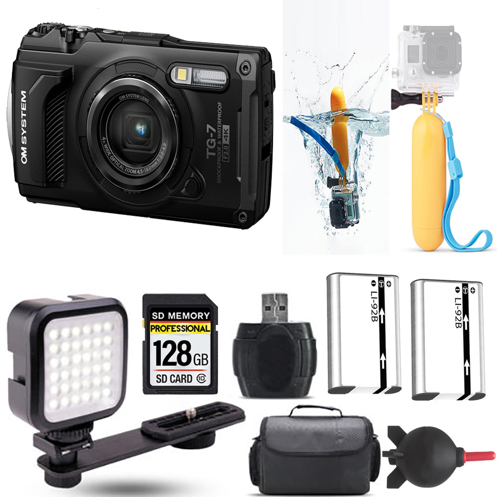 Olympus OM SYSTEM Tough TG-7 Digital Camera (Black) + Floating Hand Grip + Extra Battery + LED - 128GB Kit