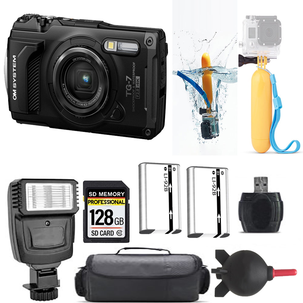 Olympus OM SYSTEM Tough TG-7 Digital Camera (Black) + Floating Hand Grip + Extra Battery + Flash - 128GB Kit