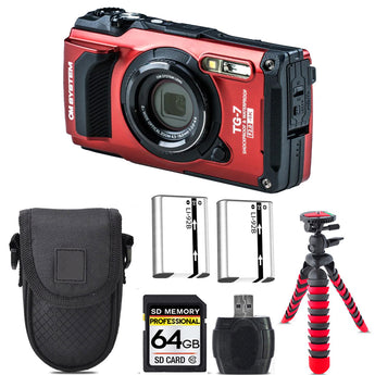 Olympus OM SYSTEM Tough TG-7 Digital Camera (Red) + Extra Battery +Tripod + Case -64GB Kit