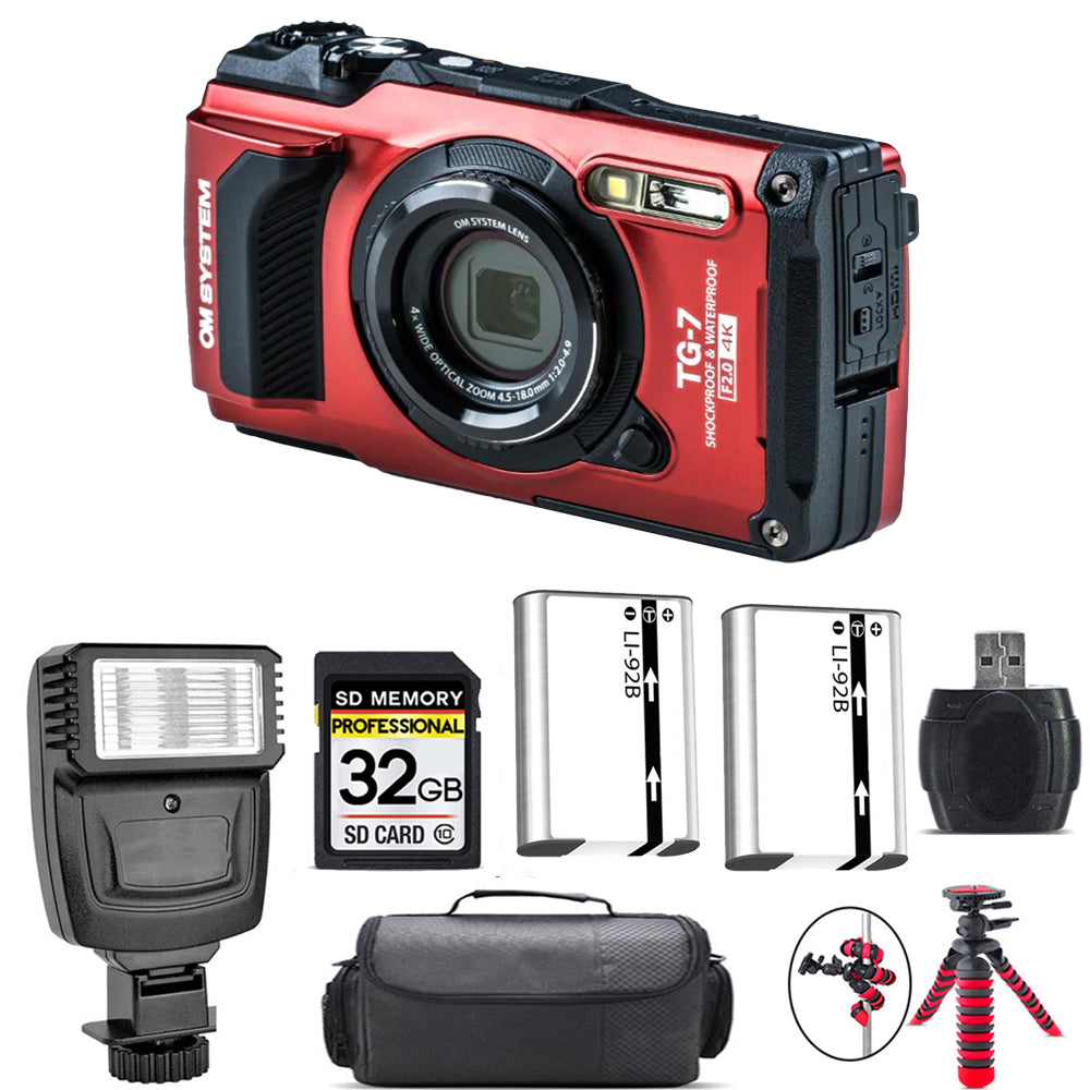 Olympus OM SYSTEM Tough TG-7 Digital Camera (Red) + Extra Battery + Flash - 32GB Kit
