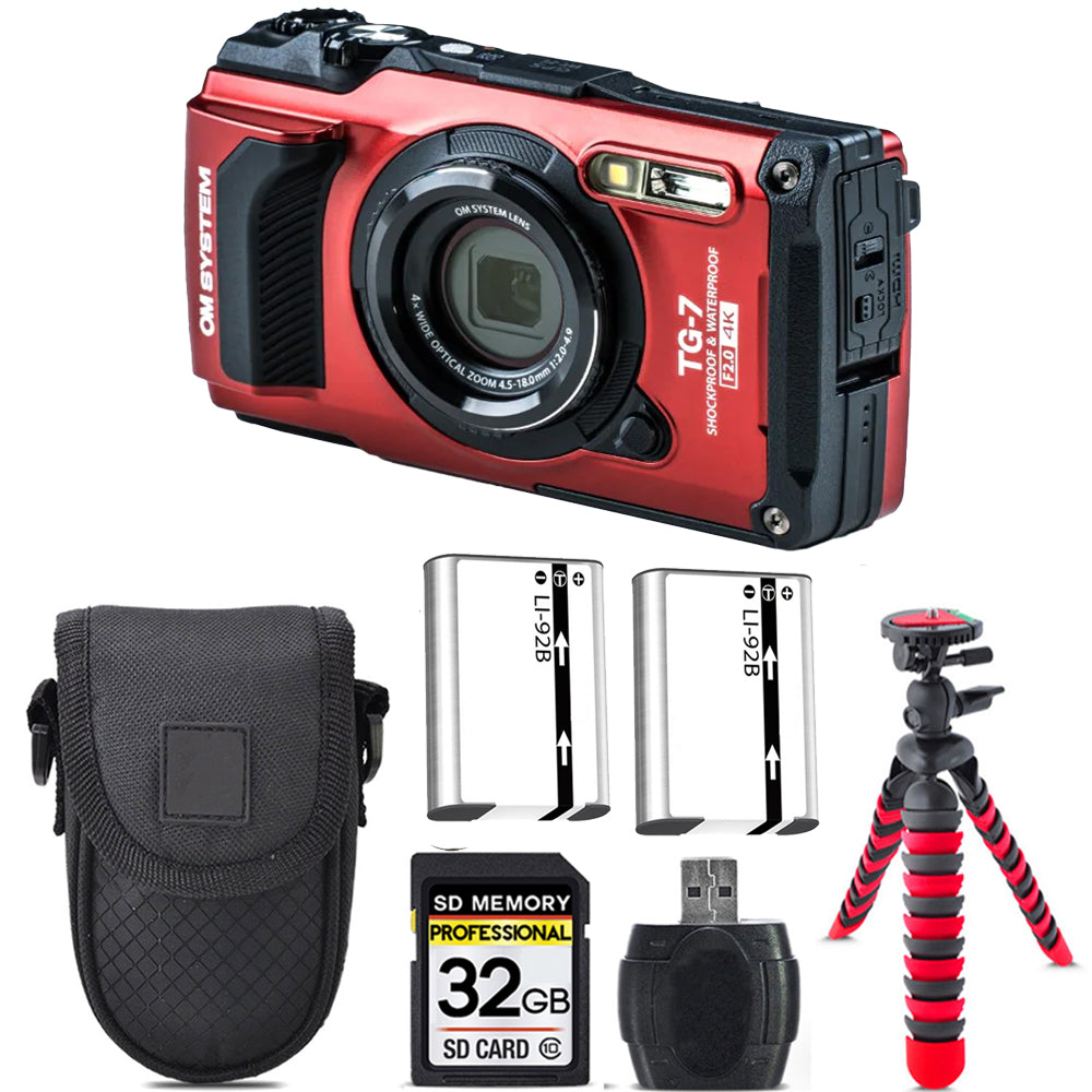 Olympus OM SYSTEM Tough TG-7 Digital Camera (Red) + Extra Battery +Tripod + Case -32GB Kit