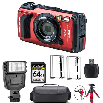 Olympus OM SYSTEM Tough TG-7 Digital Camera (Red) + Extra Battery + Flash - 64GB Kit