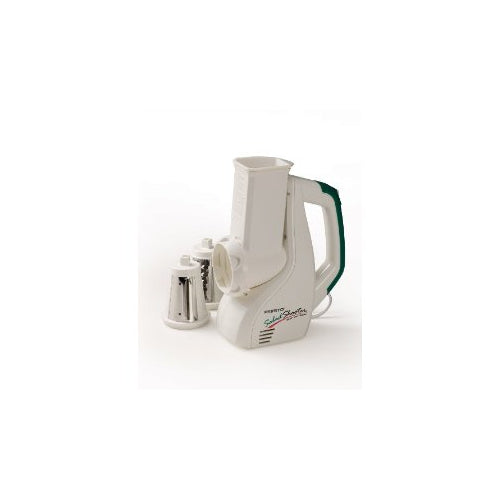 The easy way to slice and shred vegetables, fruits, cheese and more for delicious salads, soups, pizzas, tacos, and desserts. Just point and shoot right where you want. No extra bowls to clean. Grate chocolate, chop nuts, and make bread and cracker crumbs quickly and neatly. Interchangeable slicing and shredding cones slip right in. There are no complicated parts to assemble. Easy to clean and store. Base wipes clean, all other parts are dishwasher safe. Compact enough to store most anywhere. 120 volts, 60 Hz onlySaladShooter Slicer Shredder Specifications