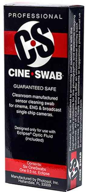 Designed for cleaning 24mm and Super 35 video camera sensors, the Photographic Solutions Cine Sensor Swab Kit comes in a box containing 6 swabs and a 0.5 oz bottle of ECLIPSE cleaning fluid. The swabs feature long handles for easier access to difficult-to-reach areas, are made with more absorbent material, and are individually packaged to ensure purity. The swabs are designed for one-time use to rid the image sensor of dust or other particles that affect image quality.CS24KIT Cine Sensor Swab kit Specifications