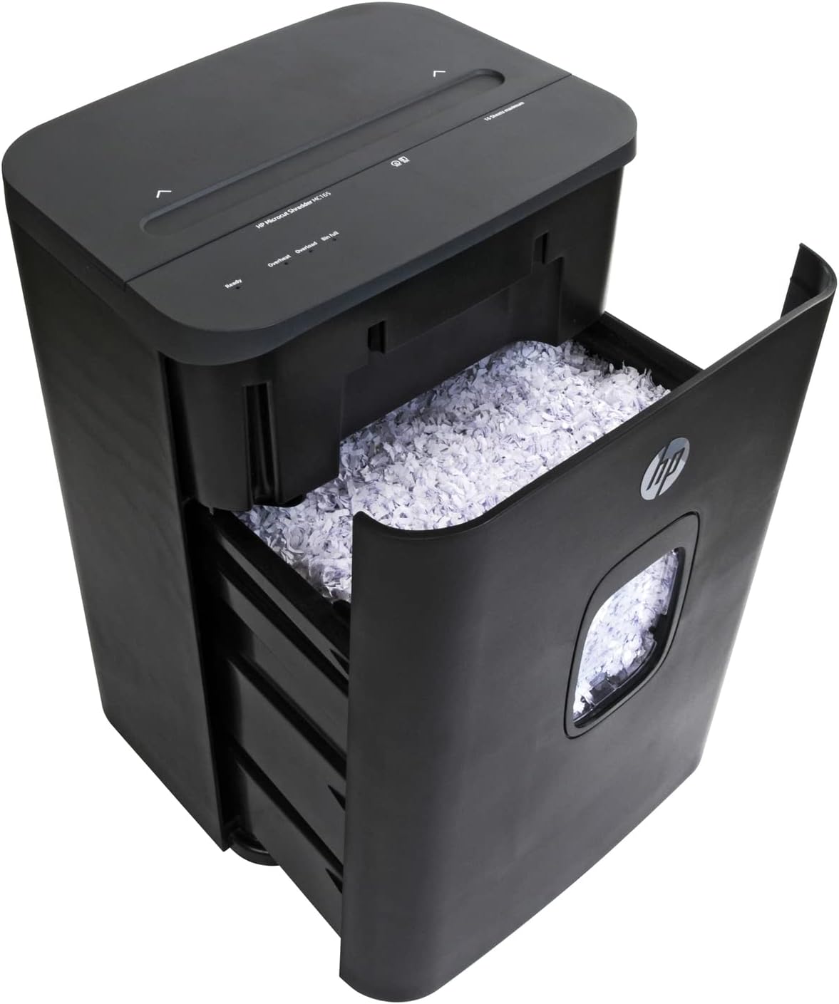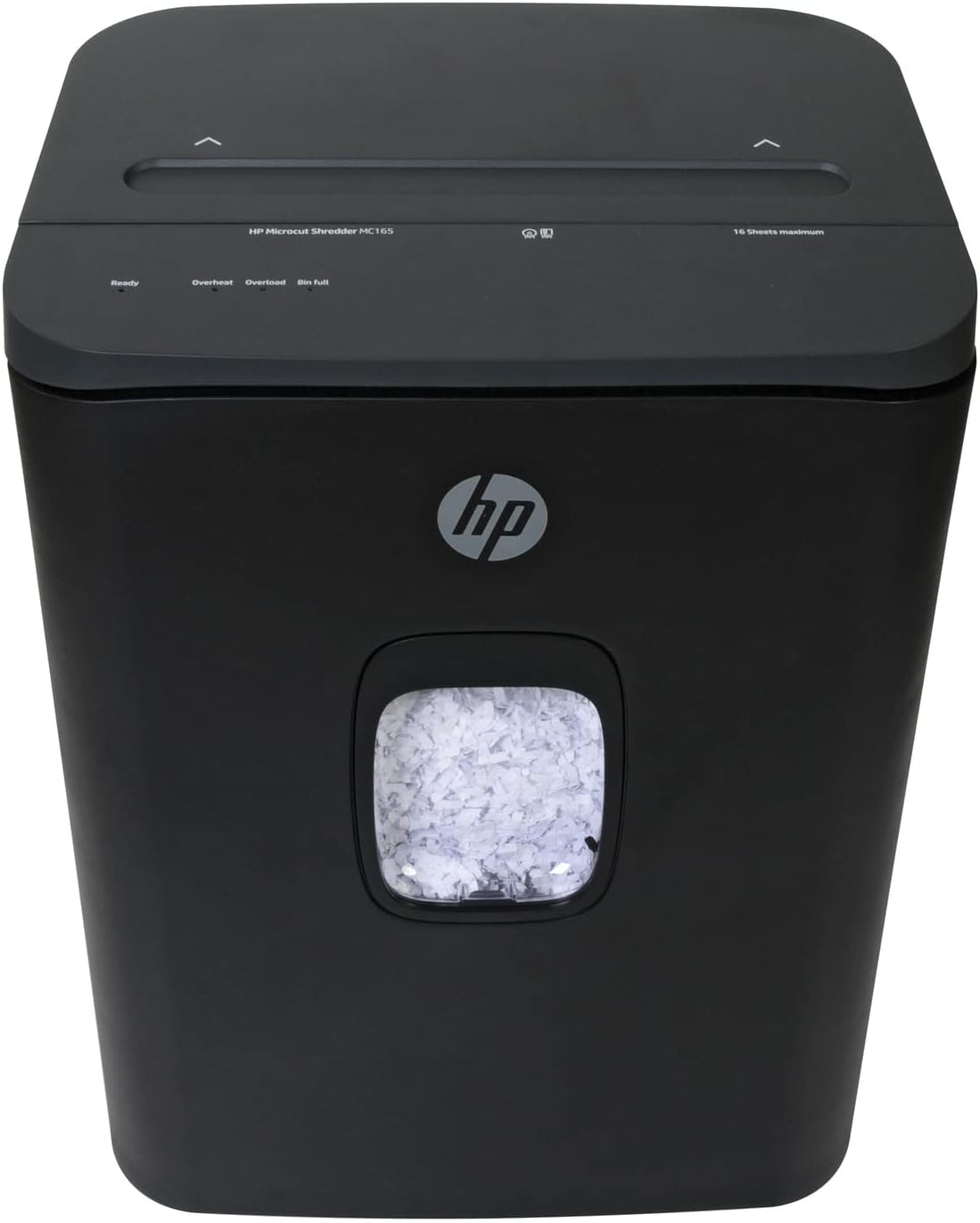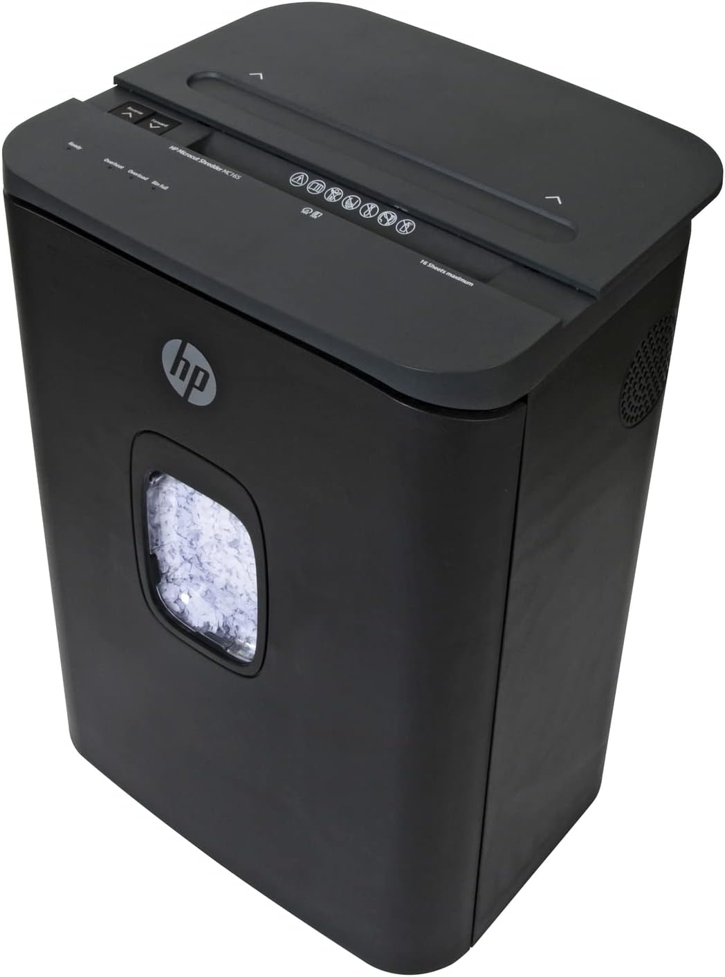 The Microcut Shredder from HP protects all sensitive documents to avoid identity theft. It shreds up to 16 sheets at a pass as well as small staples and credit cards. It also features an easy pull-out bin with viewing window so you can see when to empty. Casters let you move the machine from room to room with ease. A unique Slide-Top housing hides the paper entry slot and electronics for a smooth sleek functional surface. The extra-large 5-gal. pullout waste bin holds hundreds of shredded pages.HP 91044Q 16 Sheet Microcut Paper Shredder Specifications